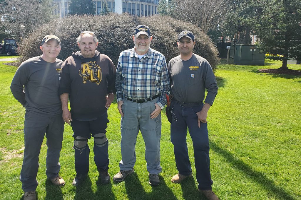 The Adelphi grounds crew, left to right: Jimmy Campbell, grounds foreperson; Federico Ortiz, grounds mechanic; Robert Conaghan, associate director of facilities management; Roberto Mendoza, grounds mechanic.