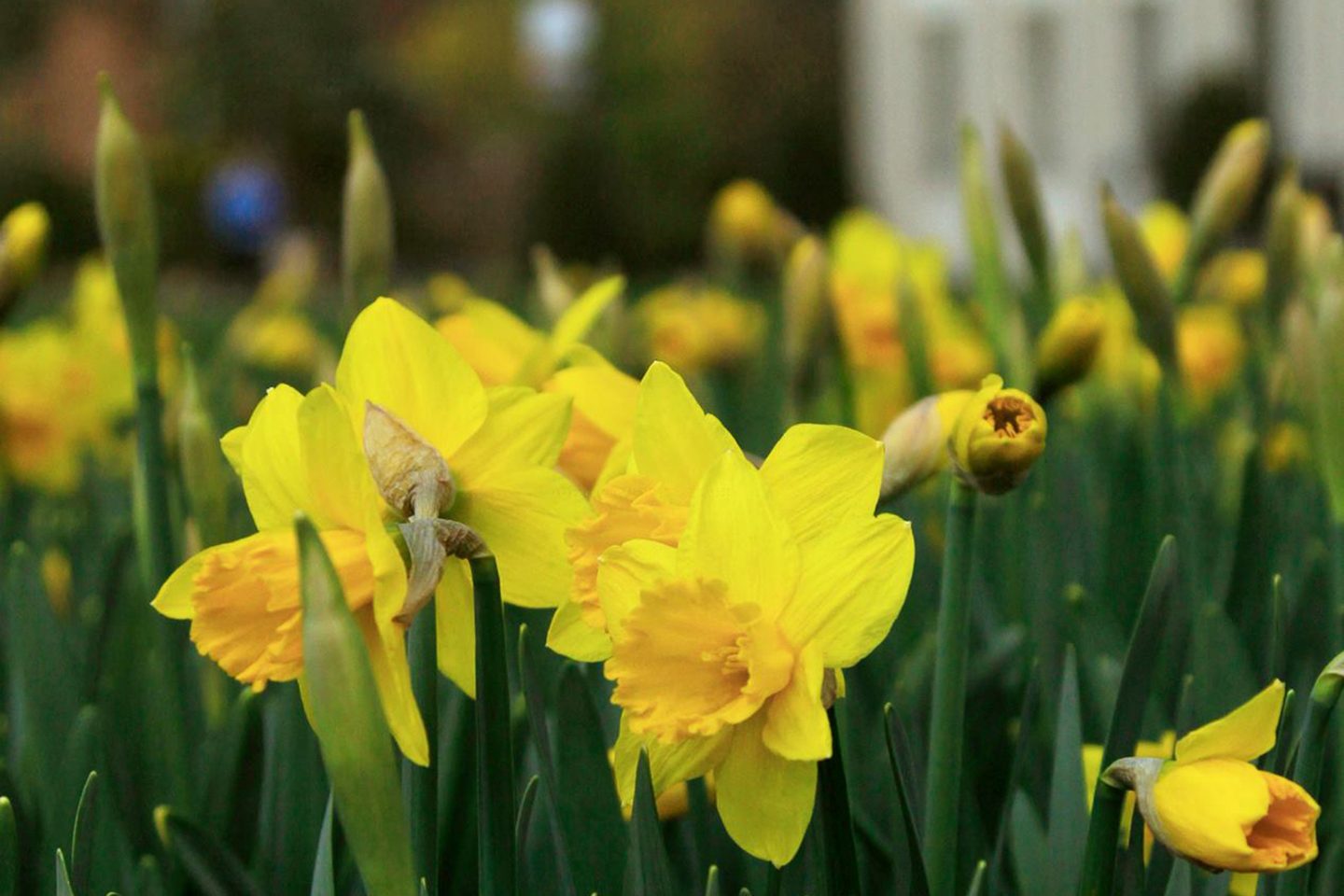Daffodils with Hagedorn Hall and the Ruth S. Harley University Center in the background.
