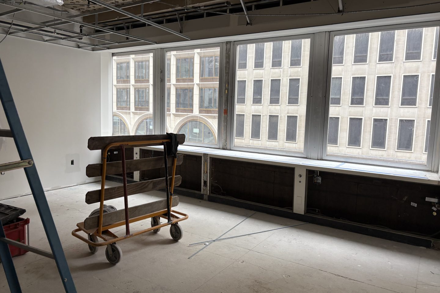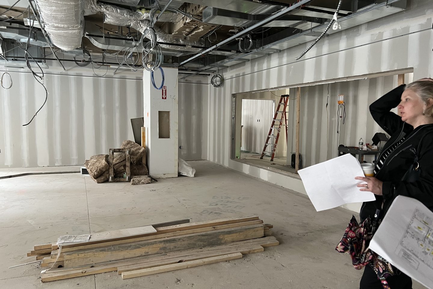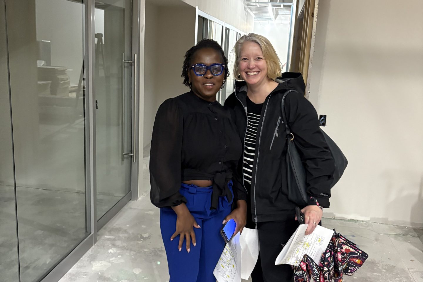 Chief Enrollment Officer Shawana Singletary and Vice Provost for Research and Libraries Andie Ward check out the progress of the glass-fronted private study rooms in the new library space.