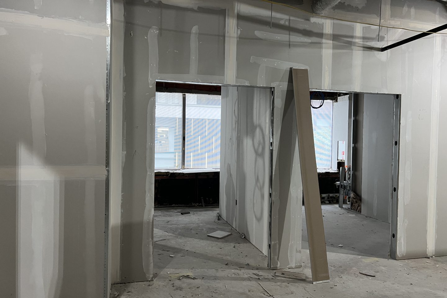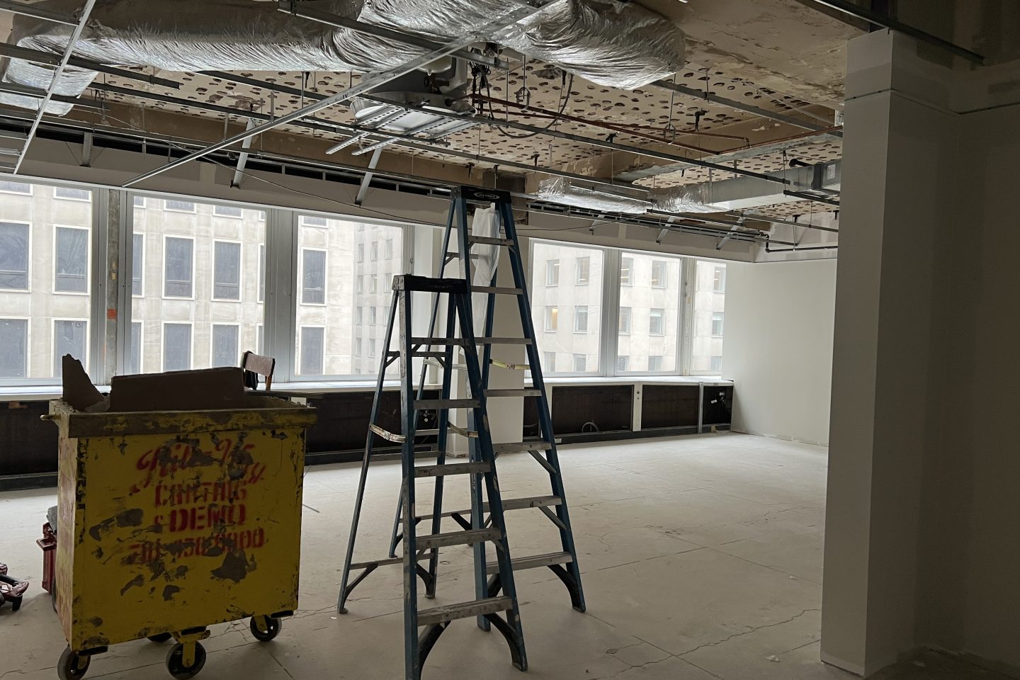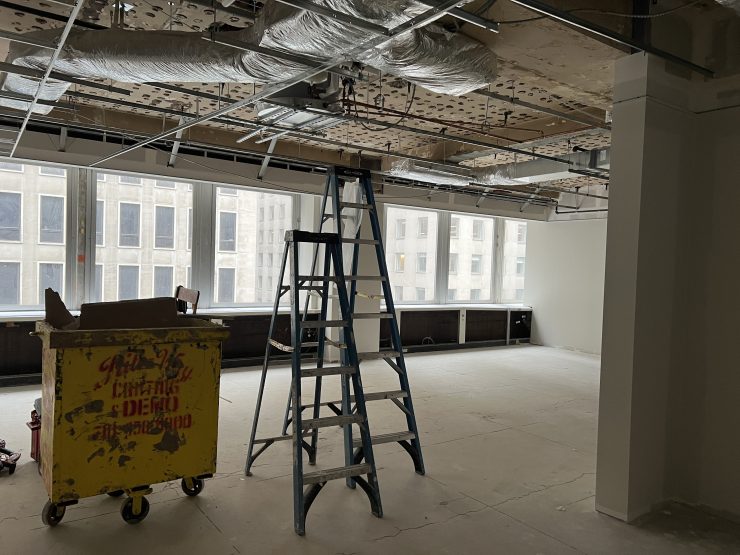 Chief Enrollment Officer Shawana Singletary and Vice Provost for Research and Libraries Andie Ward check out the progress of the glass-fronted private study rooms in the new library space.