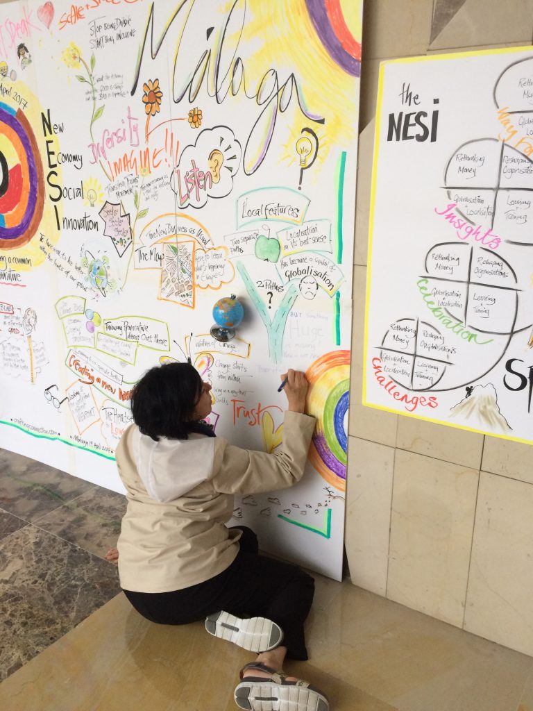 Associate Professor Melanie E. L. Bush, Ph.D. M.P.H., adds to a pictorial model at the New Economy and Social Innovation Global Forum in Malaga, Spain.
