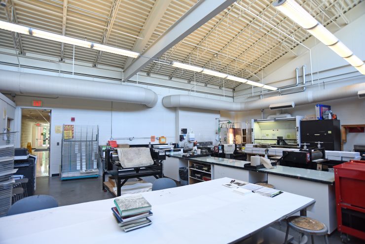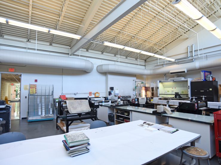 Three large Brand presses in the printmaking studio further service student work, in addition to a mini, in-house digital lab that includes a large-format archival color inkjet printer.